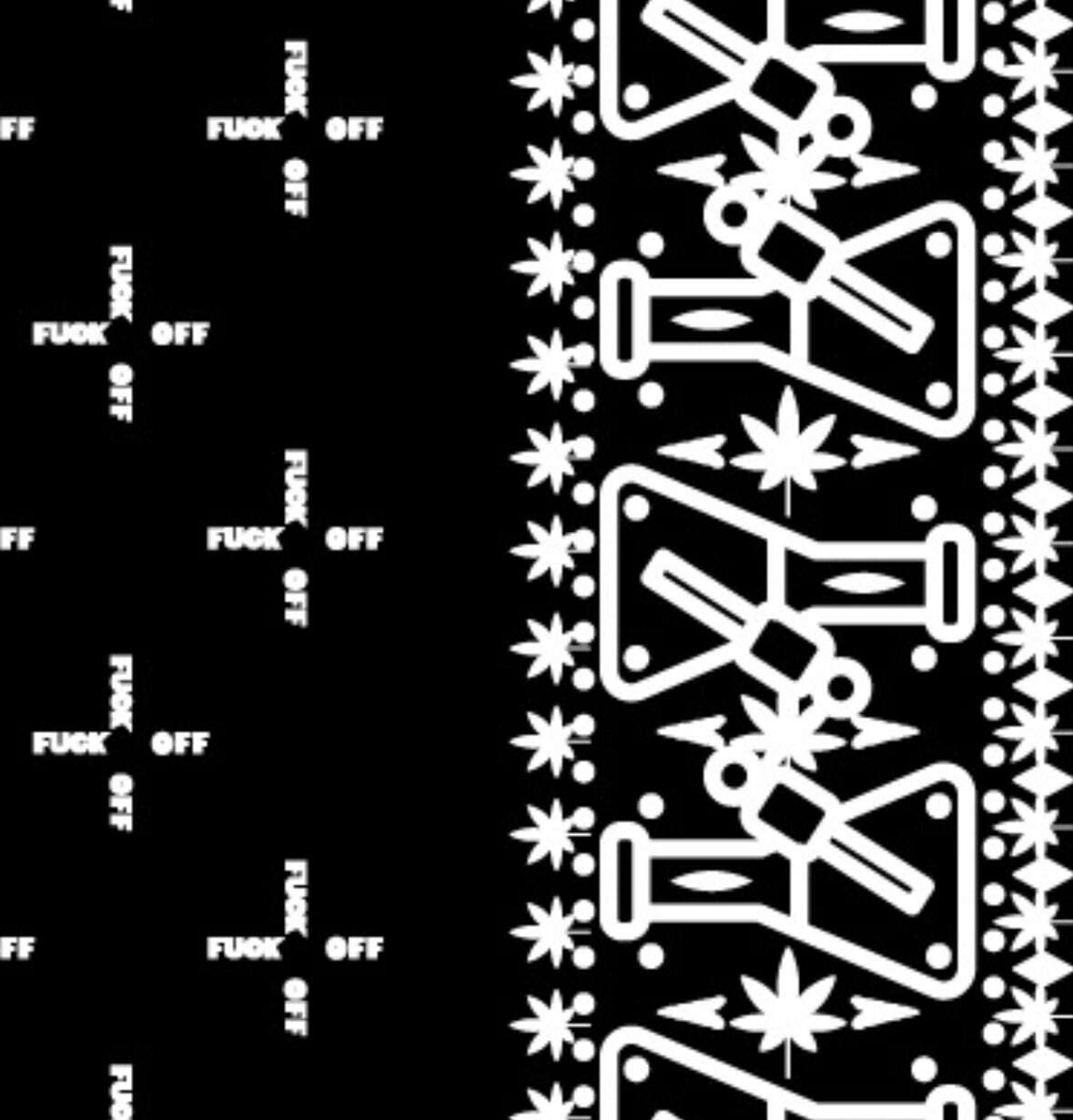 FUCKOFFクロス、ライターの火、ボング、大麻などでデザインを構成しました。