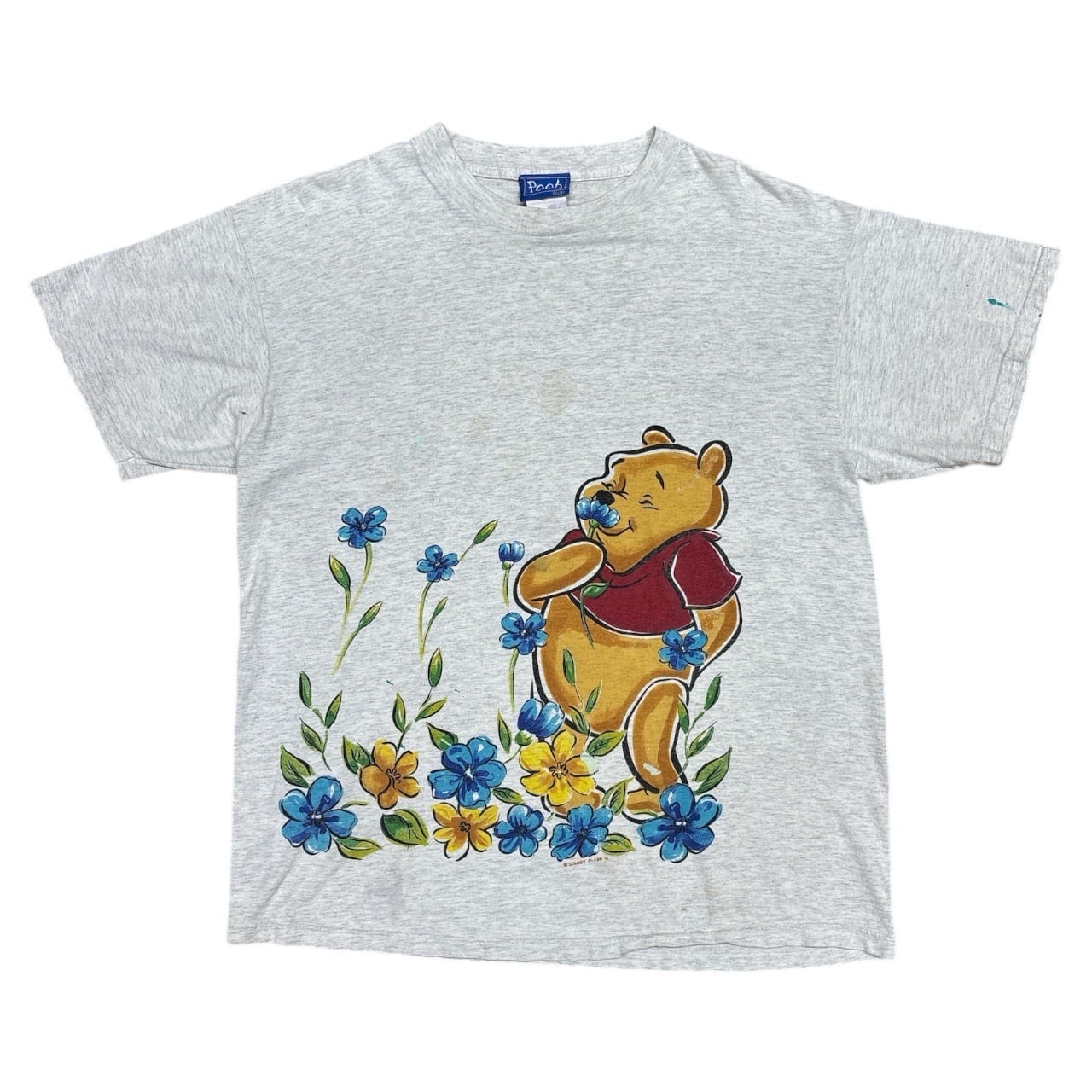 90年代のヴィンテージDisney Tシャツで、くまのプーさんをフィーチャーした可愛らしいプリントが施されたグレーボディのグッドデザインなアイテムです。