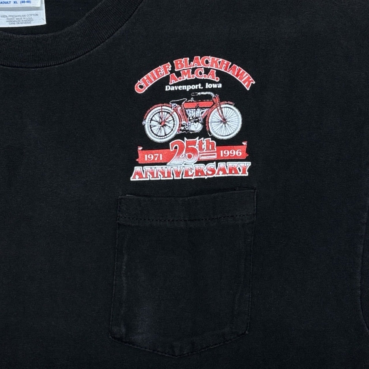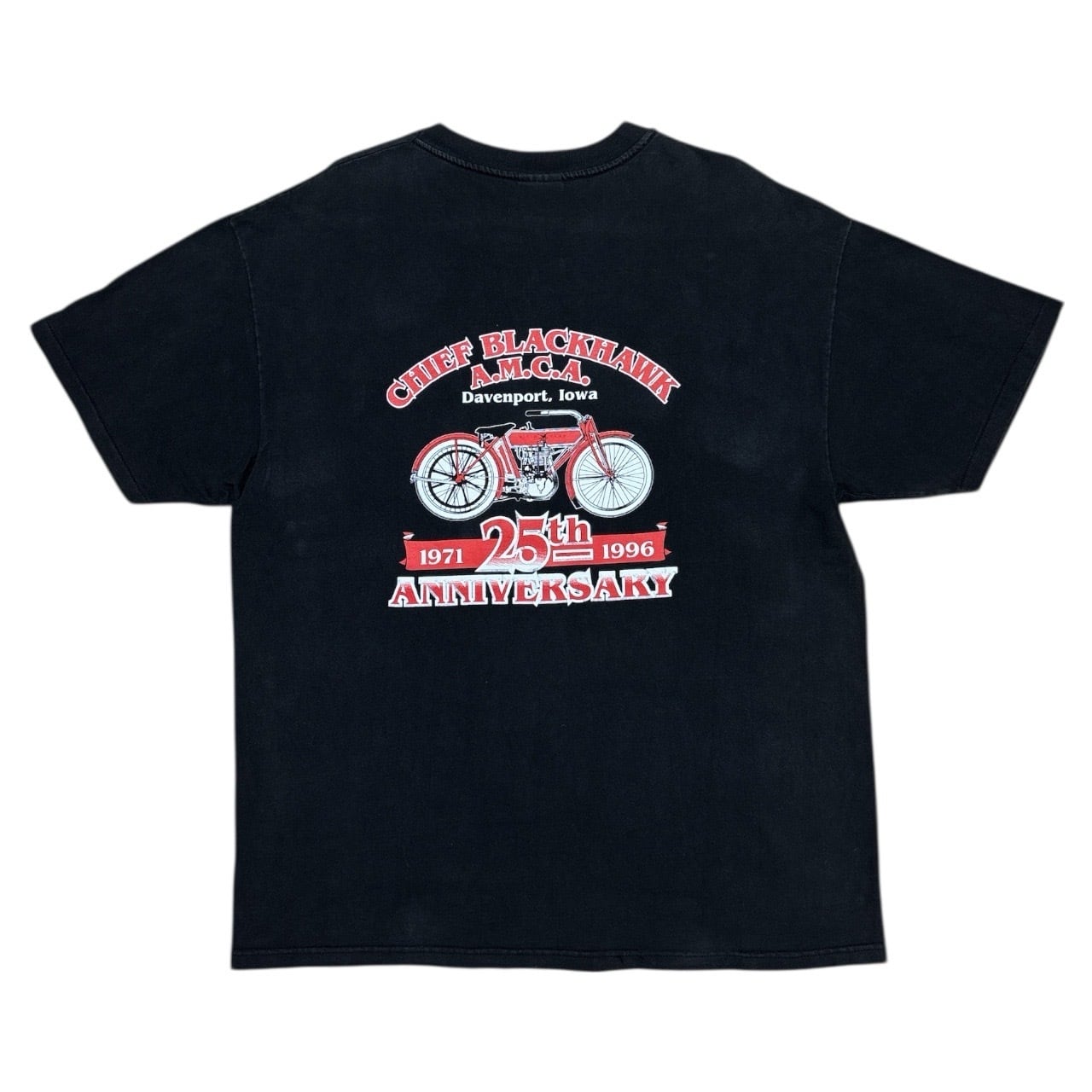 CHIEF BLACKHAWK A.M.C.Aの堂々たるグラフィックが刻まれた、Antique Motorcycle Club Association(A.M.C.A)の25周年公式記念Tシャツ。