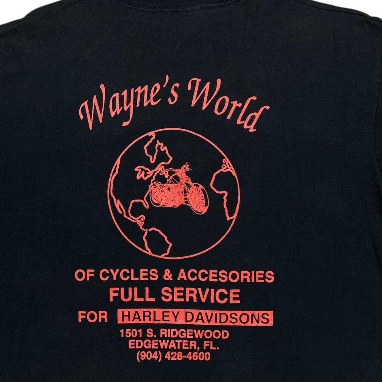 90年代のアメリカのモーターサイクルショップ「Wayne's World」が作ったバイカーTシャツです。ハーレー愛あふれるショップの魂が詰まった一枚。
